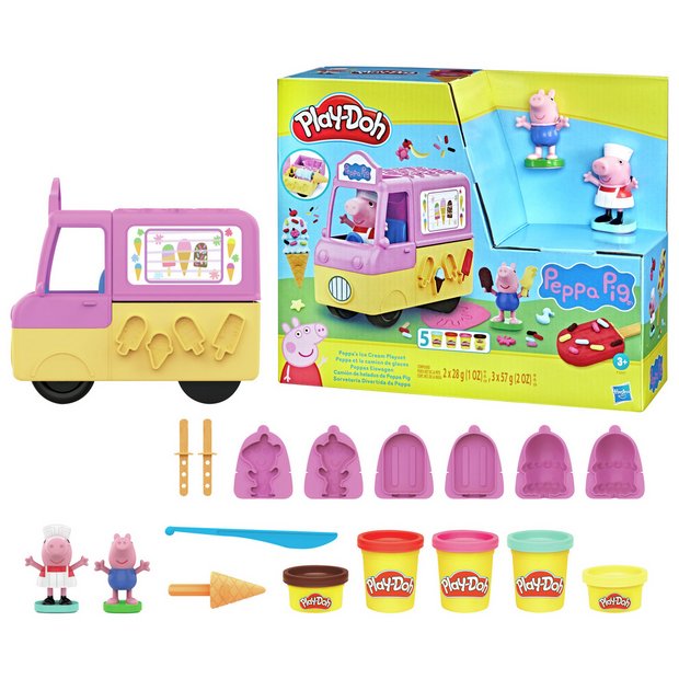 Peppa's Ice Cream Truck: The truck's built-in molds make imaginary sweets, and its back wheels roll out syrup shapes! the Peppa and George stamper figures can ride up front for more storytelling fun.