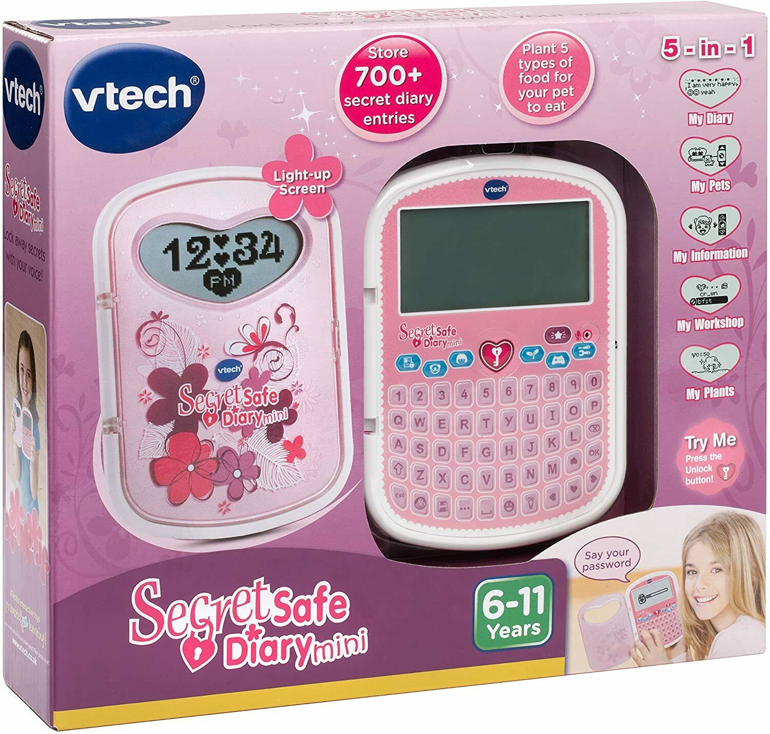 Keep all of your secrets locked away! This pocket-sized diary features a voice activated locking system that only responds to your voice. You can write your own secret diary, take care of a virtual pet and plants, play lots of great girly games, store friend's information and use the alarm. Pocket-sized voice activated secret diary - record your own password. Features a QWERTY keyboard and activity shortcut buttons and alarm clock.